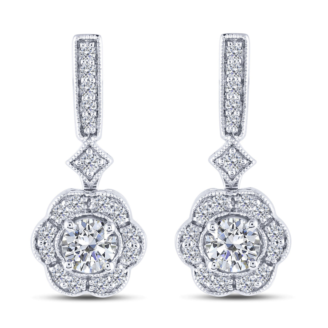 These exquisite 14K white gold dangle earrings showcase a total of 0.75 carats of brilliant...