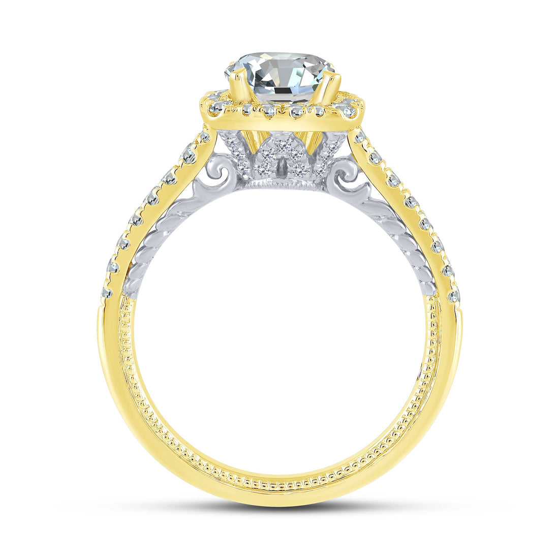 This exquisite two-tone 14K gold semi-mount ring embodies timeless elegance with a vintage aesthetic, designed...