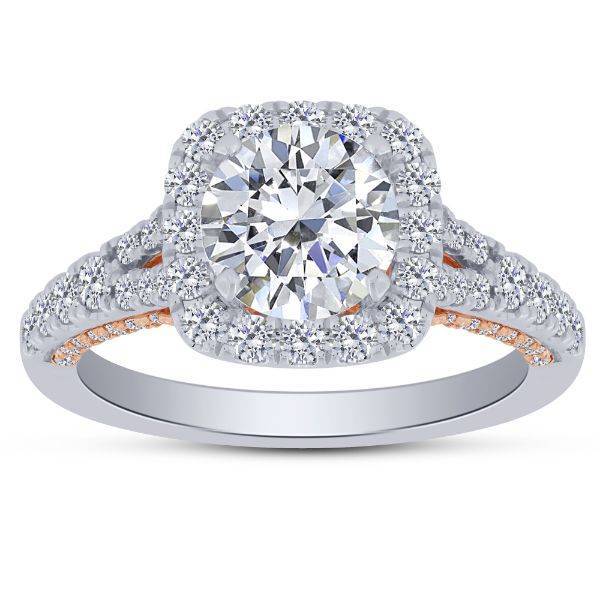 This exquisite two-tone semi-mount ring features a stunning halo of 1.11 carats of natural diamonds,...