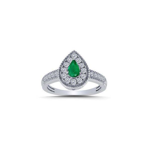 This exquisite ring features a vibrant 0.46 carat natural oval emerald at its center, beautifully...