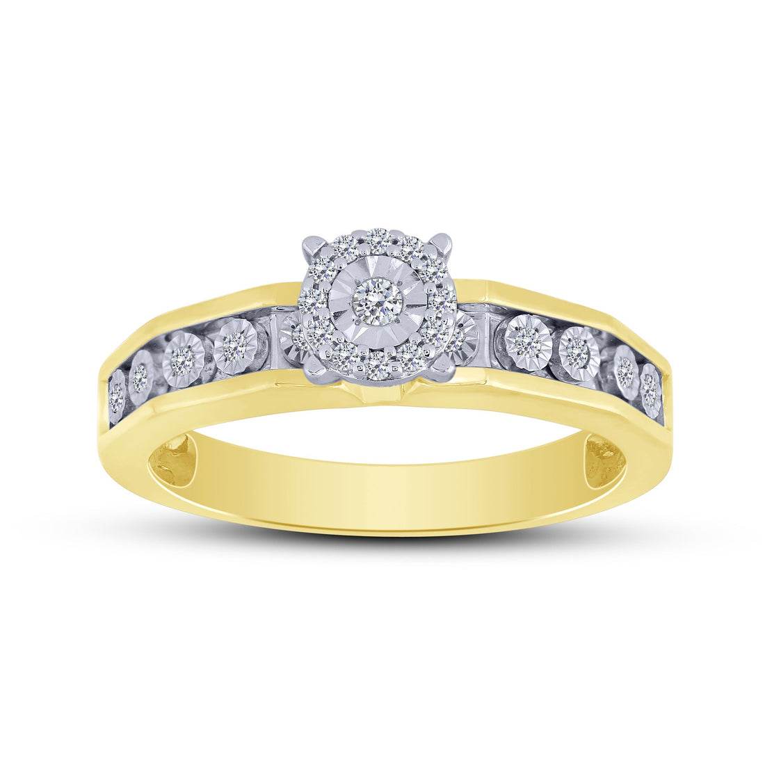This exquisite ring features warm 14K yellow gold setting a brilliant 0.20 carat total weight...