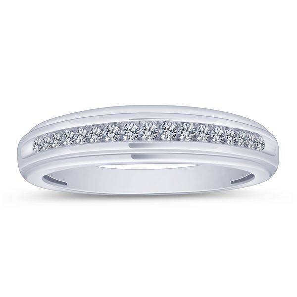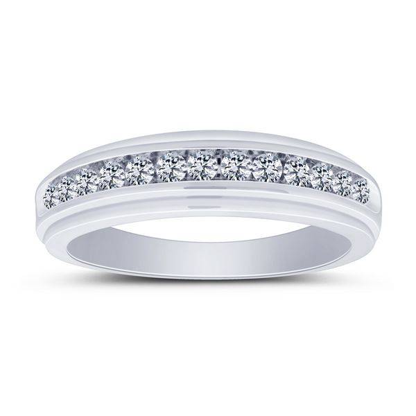 This men's band features a classic channel setting of natural diamonds in lustrous 10K white...