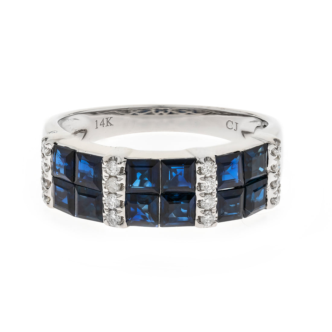 Crafted in luminous 10K white gold, this ring offers a distinguished centerpiece of natural blue...