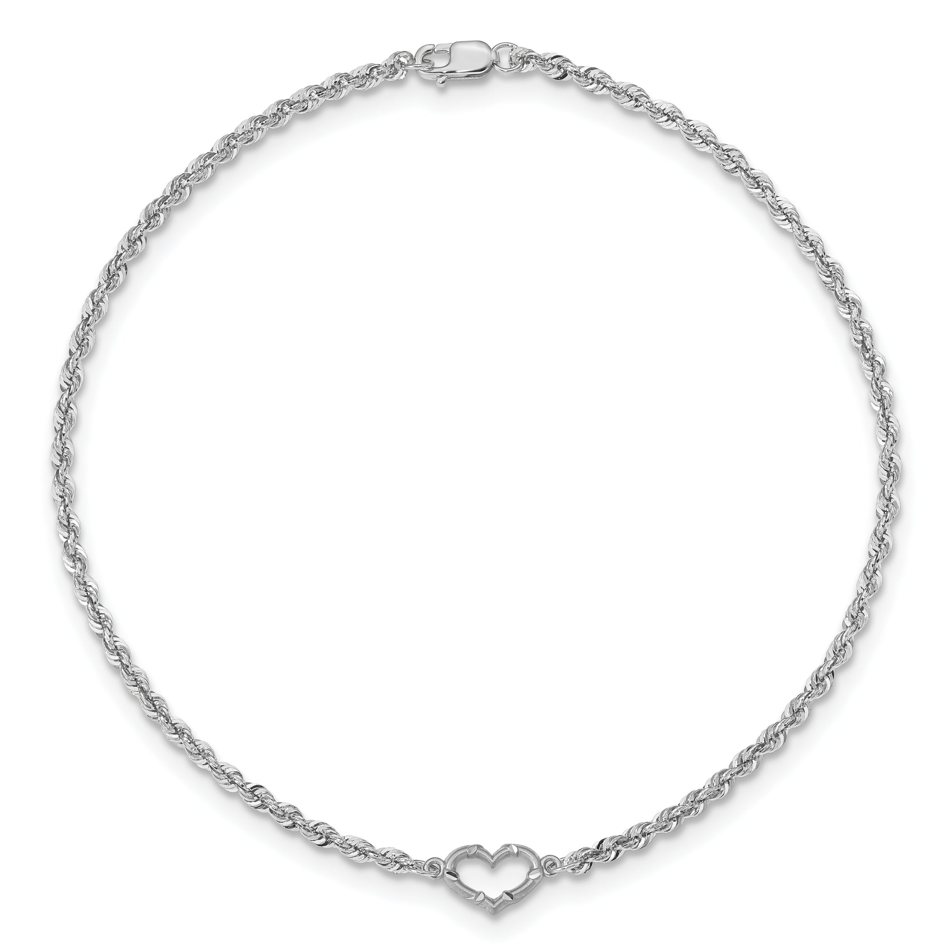 14K White Gold Diamond-Cut Rope With Heart 9In Anklet