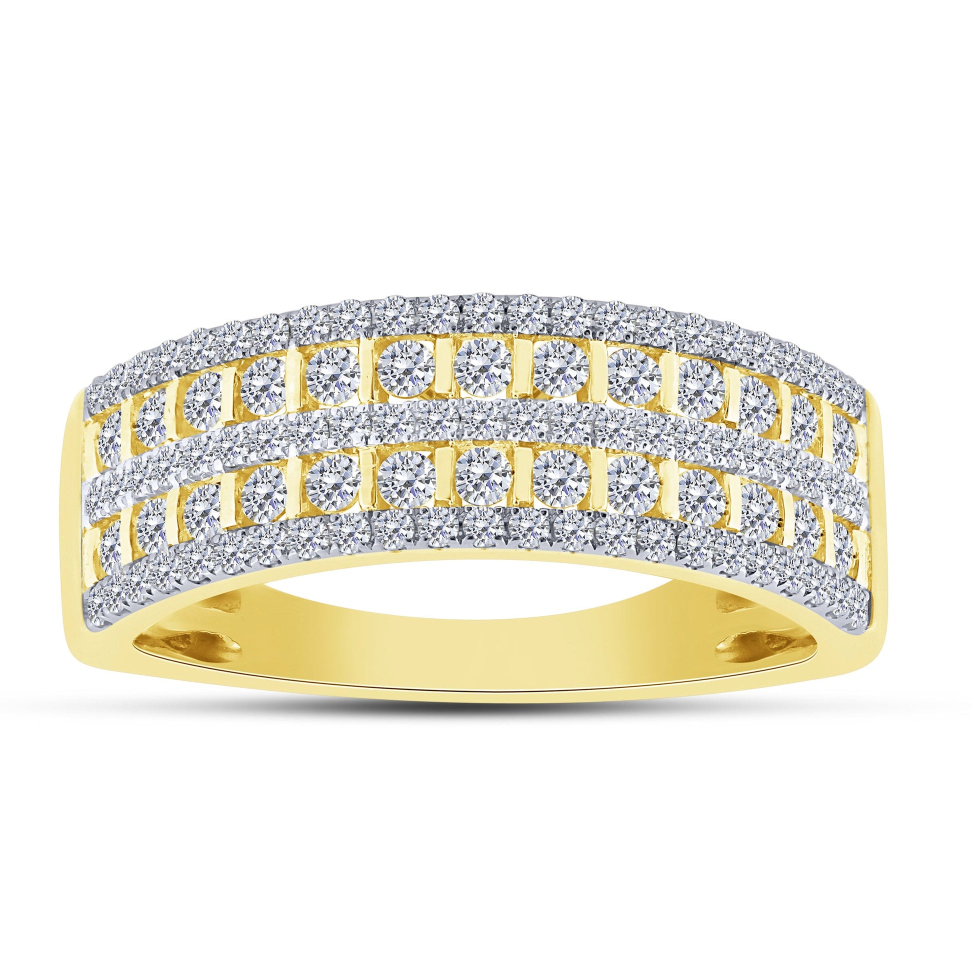 This striking men's band, crafted in rich 14K yellow gold, features two brilliant rows of natural diamonds for a total carat weight of 0.75 Ctw. The 14K Yellow Gold 0.75 Ctw Diamond 2 Row Mens Band provides a bold yet sophisticated statement, perfect for a wedding band or a timeless fashion piece.