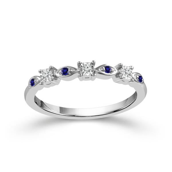 This slender band is crafted from luminous 10k white gold, featuring seven round-cut stones for a delicate yet impactful sparkle. Adorned with 0.06 total carat weight of blue sapphire and accent diamonds, the 10k white gold 0.06 ctw blue sapphire band offers a sophisticated splash of color perfect for stacking or wearing alone.