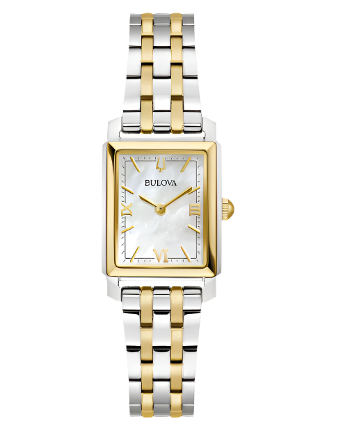 This striking two-tone timepiece from the Sutton Collection showcases a sophisticated rectangular case with a silver-tone body and a warm gold-tone frame. The shimmering mother-of-pearl dial, accented with gold-tone markers, gives the Bulova Classic Sutton Mop Tank Women's Watch 98L308 a look of timeless elegance and modern appeal.