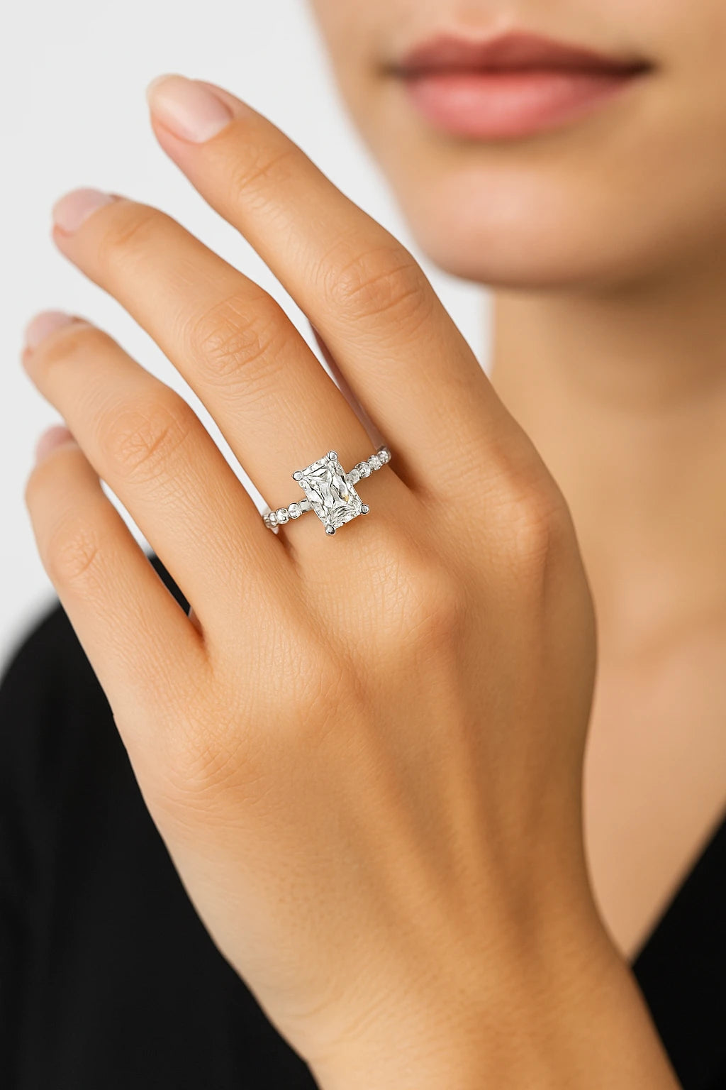 This exquisite platinum engagement ring features a stunning 2.51 carat lab-grown emerald-cut diamond at its center, complemented by 0.38 carats of natural side diamonds for a total carat weight of 2.89 carats. The Platinum 0.38 ctw Natural 2.51 Center Lab-Grown Diamond Emerald Engagement Ring offers exceptional brilliance and a classic design perfect for a lifelong commitment.
