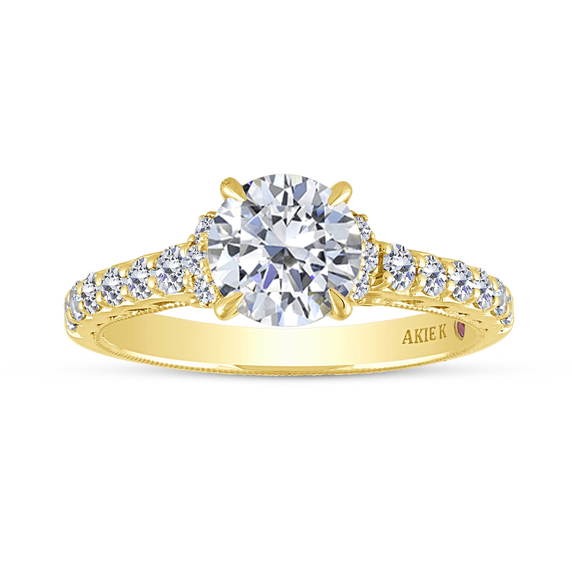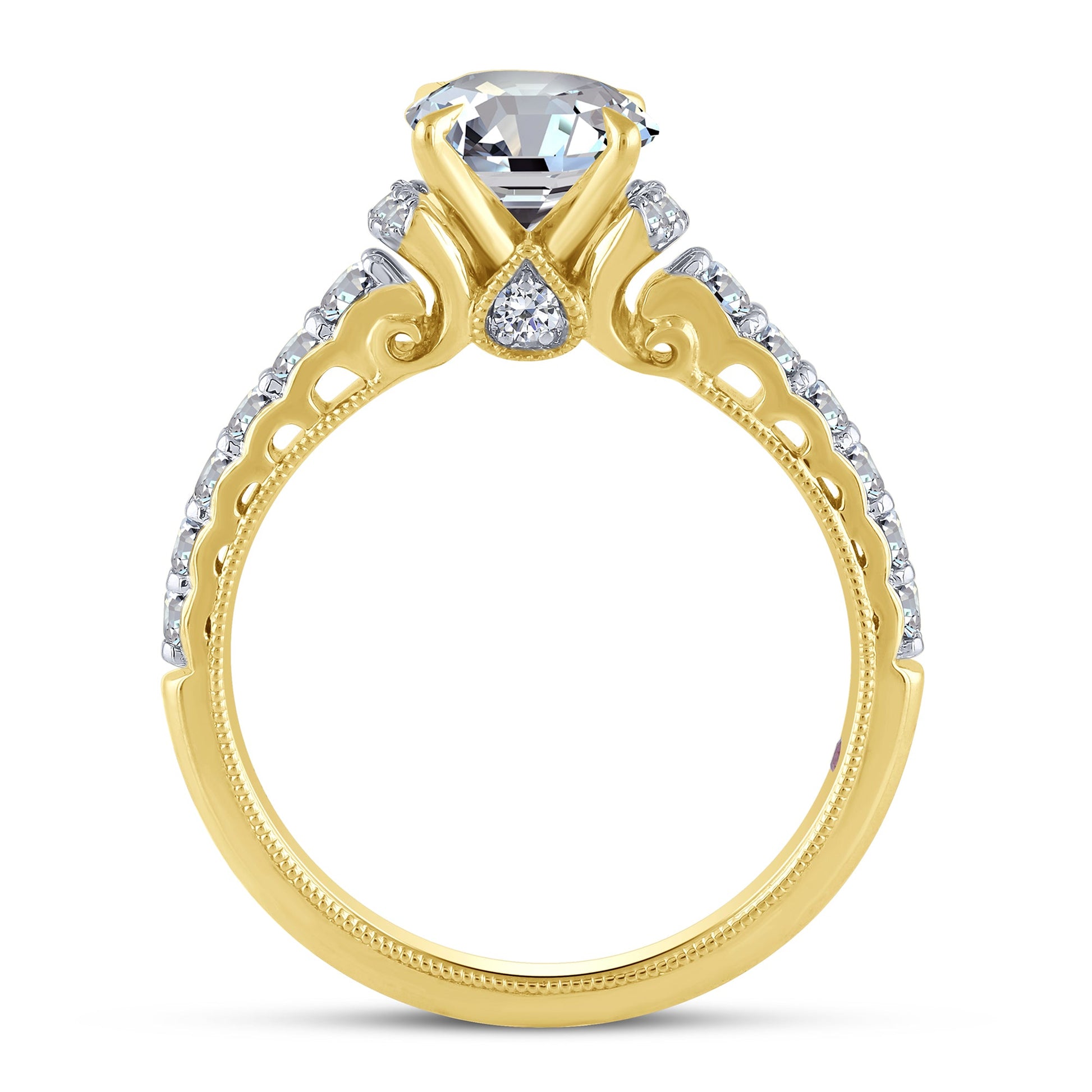 This exquisite mounting is crafted from luminous 14K yellow gold, featuring 0.50 carats total weight of sparkling side diamonds designed to beautifully frame a 1.25-carat center stone (not included). The semi-mount allows for personalization, offering an elegant foundation for your chosen diamond in the 14K Yellow Gold 0.50 CTW Diamond Solitaire MOUNT.