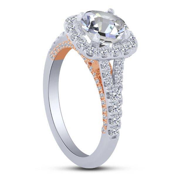 This exquisite two-tone semi-mount ring features a stunning halo of 1.11 carats of natural diamonds, perfectly poised to highlight your chosen center stone. Crafted in 14K white and rose gold, the 14K Two Tone Cushion Diamond Semi Mount Engagement Ring provides a breathtaking foundation for a timeless proposal, blending modern sophistication with romantic sparkle.