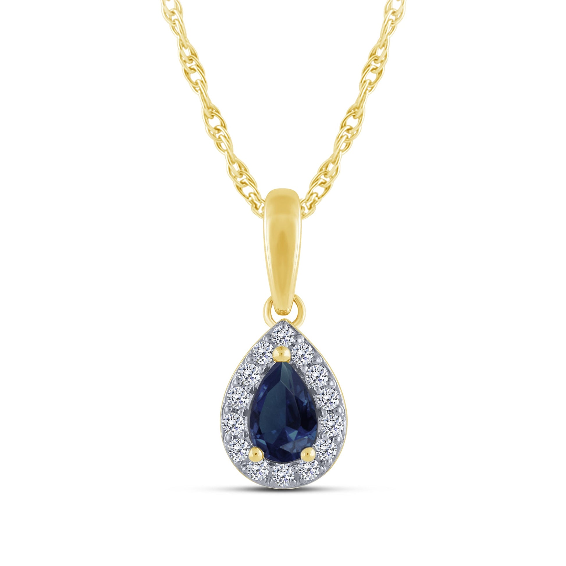 This exquisite pendant features a deep blue, pear-shaped sapphire as its centerpiece, framed by brilliant white sapphire accents and set in warm 10K yellow gold. The 10K Yellow Gold PEAR SHAPED BLUE SAPPHIRE PENDANT offers a classic, luxurious touch, perfect for adding a pop of color and sophistication to any ensemble.