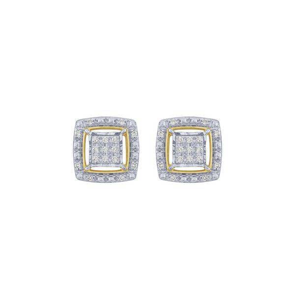 These sophisticated 10K gold stud earrings feature a cushion-shaped diamond illusion design in a stylish two-tone setting, offering the appearance of a much larger stone. Adorned with 0.15 carats of brilliant natural diamonds, the 10k Two Tone 0.15 ctw Diamond Cushion Stud Earrings provide versatile luxury for daily wear or special occasions.