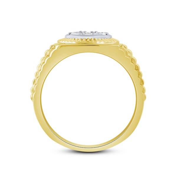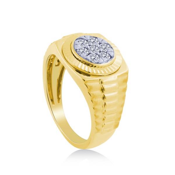 This striking men's ring is crafted from brilliant 14K yellow gold, featuring a classic, bold design inspired by luxury timepieces. The ring showcases a cluster of natural diamonds totaling 0.50 carats, offering sophisticated sparkle. The 14k yellow Gold 0.50 ctw Diamond men's Ring combines comfort fit with timeless appeal, perfect as a fashion piece or an unconventional wedding band.