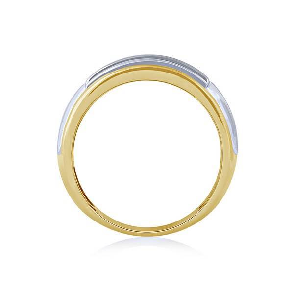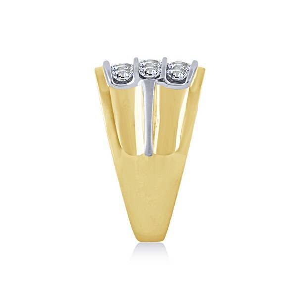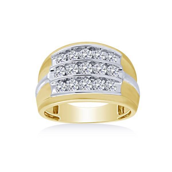 This fancy 14K yellow gold men's ring, accented with white gold, presents a semi-eternity design with a three-row channel setting for maximum brilliance and ultimate durability. The rounded inside edge ensures a comfortable fit for this remarkable piece, the 14k yellow Gold 1.50 ctw Diamond men's Ring, designed for sophisticated daily wear.