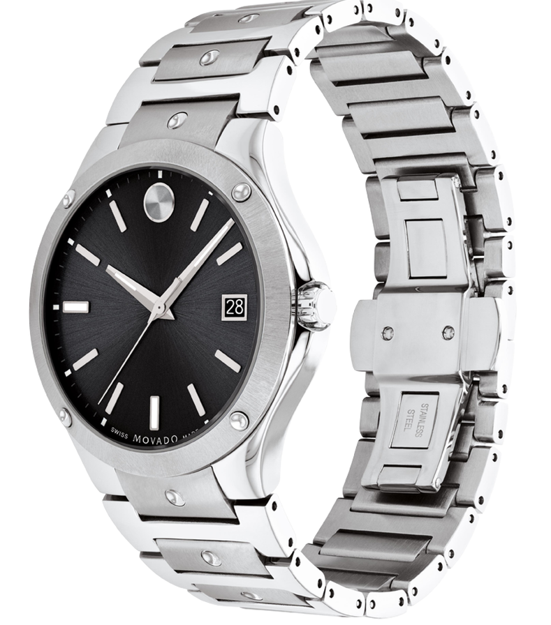 This timepiece features a 41mm dual-finished stainless steel case and bracelet, accented with Movado's signature silver concave polished dot. The striking black sunray dial, protected by an anti-reflective sapphire crystal, makes the Movado SE Dual-Finished Stainless-Steel Watch 0607541 a sophisticated choice for modern wear.