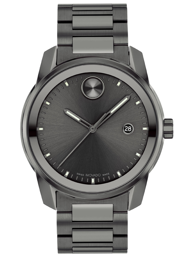 This striking timepiece features a gunmetal ion-plated stainless steel case and bracelet, offering a monochromatic, high-impact aesthetic. The Movado BOLD Verso Gunmetal Ion-Plated Bracelet Watch 3600736 seamlessly blends modern style with functional design, highlighted by a date window and Super-LumiNova accents for visibility.