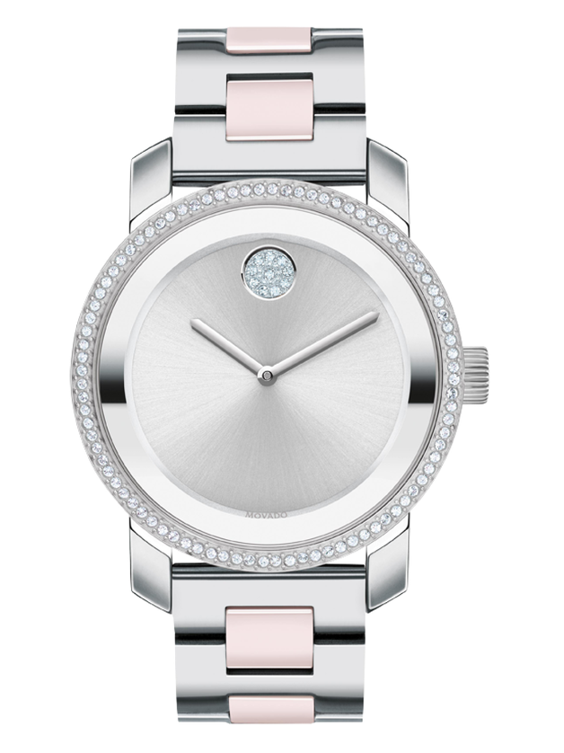 This timepiece showcases a modern and feminine design, crafted with a stainless steel case and bracelet featuring soft blush ceramic centerlinks. The stunning silver-toned dial is accented by a crystal pave dot and a sparkling crystal-set bezel, defining the elegant aesthetic of the Movado BOLD Ceramic Ladies Watch 3600784.