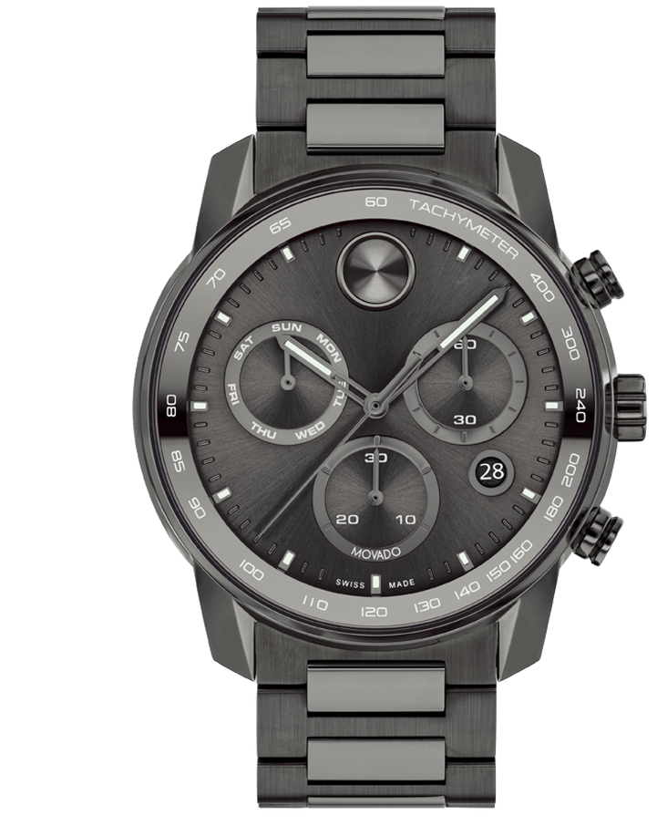 This striking timepiece features a bold 44 mm gunmetal ion-plated stainless steel case and matching bracelet, making a powerful statement of modern design. With its dark chronograph dial and Swiss Super-LumiNova accents, the Movado BOLD Verso Gunmetal Watch 3600867 offers sophisticated functionality and rugged style for the discerning wearer.