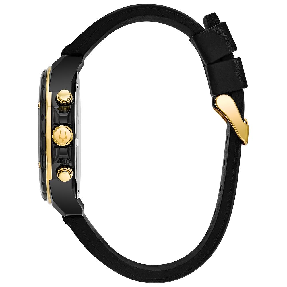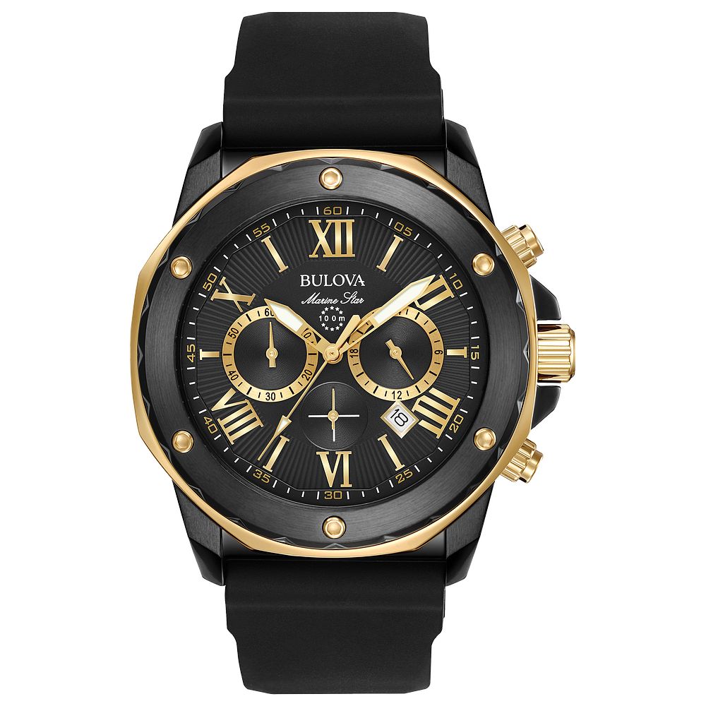 This dynamic timepiece from the Marine Star Collection features a six-hand chronograph with calendar, presented in a striking black IP and gold-tone stainless steel case. The Bulova Performance Marine Star Mens Watch Stainless Steel combines robust design with sophisticated style, perfect for performance and daily wear.