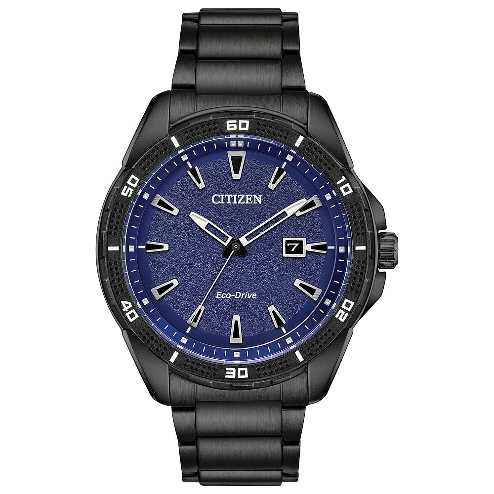 Show your inner drive with the sporty styling of this Eco-Drive watch, featuring a black ion-plated stainless steel case with black chroma finishing on the bezel. The dark blue dial and matching bracelet make the Men's Drive from Citizen Eco-Drive Watch AW1585-55L a powerful accessory for any man on the move.