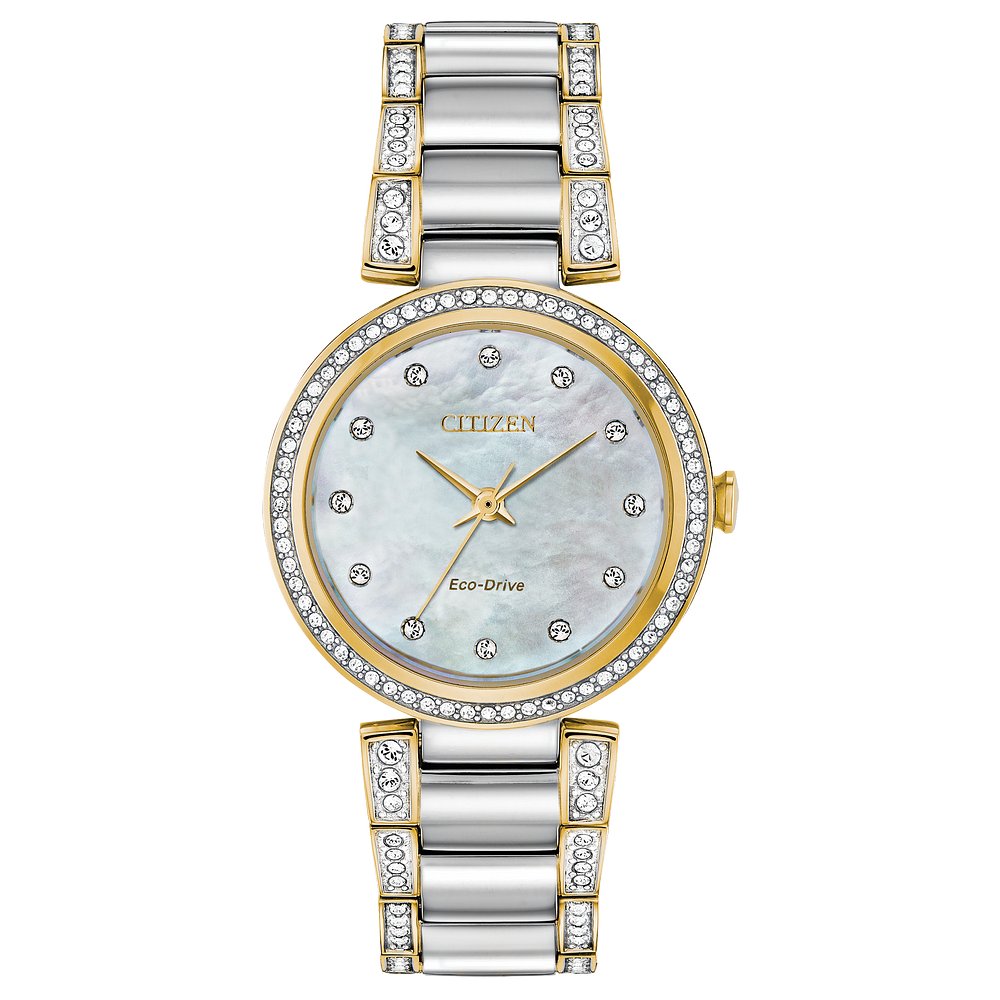 This striking timepiece features a sophisticated two-tone stainless steel design, accented by shimmering crystals along the bracelet and bezel, perfectly complementing the iridescent mother-of-pearl dial. The light-powered Eco-Drive technology ensures this elegant accessory, the CITIZEN Eco-Drive Quartz Crystal WATCH EM0844-58D, transitions flawlessly from day to evening wear.