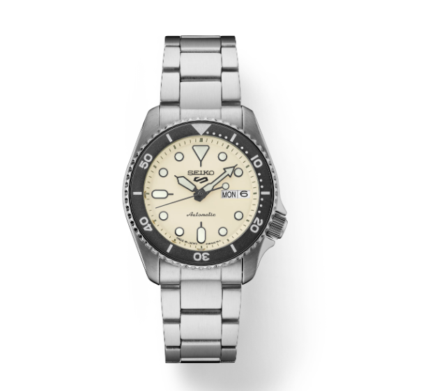 This mid-size SKX design automatic timepiece features vintage styling with an ivory/beige dial and a durable stainless steel sport bracelet. The Seiko Beige Dial Day Date Automatic Men's Watch offers reliable automatic technology with a day/date calendar, perfect for everyday wear and casual sophistication.